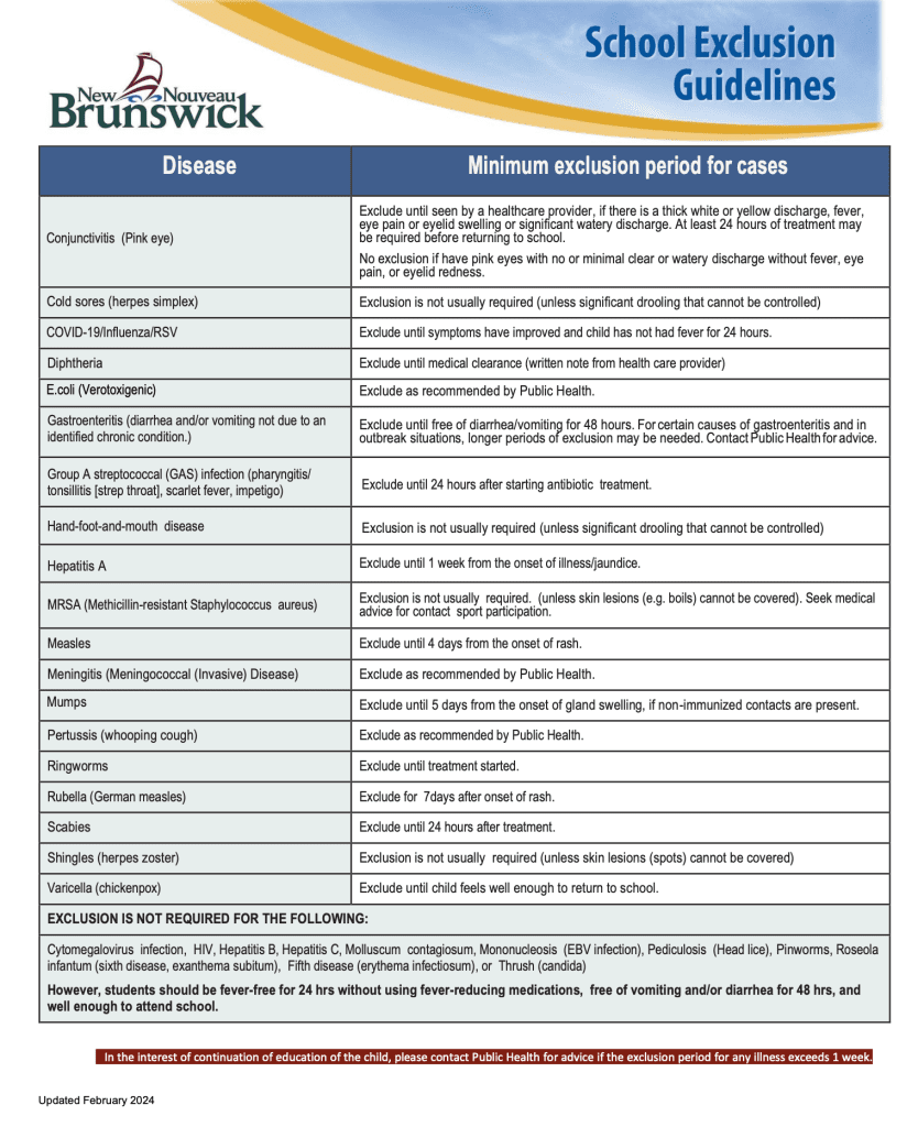 Here is the updated New Brunswick School Exclusion Guidelines to this week’s newsletter for your reference: